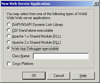 Using the WebBroker technology, you can begin developing an ISAPI or CGI application or an Apache module easily. On the first page (New) of the New Items dialog box, select the Web Server Application icon. The subsequent dialog box will offer you a choice among ISAPI, CGI, Apache 1 or 2 module, and the Web App Debugger: