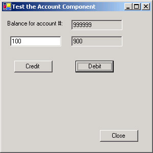 Private Sub btnCredit_Click(ByVal sender As System.Object, _ ByVal e As System.EventArgs) Handles btnCredit.Click Dim objAccount As Account = New Account() Dim newBalance As Decimal Dim amount As Decimal amount = CType(txtAmount.Text, Decimal) newBalance = objAccount.Credit(txtAccountNumber.Text, amount) txtNewBalance.Text = CType(newBalance, String) End Sub Private Sub btnDebit_Click(ByVal sender As System.Object, _ ByVal e As System.EventArgs) Handles btnDebit.Click Dim objAccount As Account = New Account() Dim newBalance As Decimal Dim amount As Decimal amount = CType(txtAmount.Text, Decimal) newBalance = objAccount.Debit(txtAccountNumber.Text, amount) txtNewBalance.Text = CType(newBalance, String) End Sub