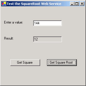 Private Sub btnSquare_Click(ByVal sender As System.Object, _ ByVal e As System.EventArgs) Handles btnSquare.Click Dim objSquare As SquareRootService.Square = _ New SquareRootService.Square() Dim inputValue As Double Dim webResult As Double inputValue = CType(txtValue.Text, Double) webResult = objSquare.GetSquare(inputValue) txtResult.Text = webResult.ToString objSquare = Nothing End Sub