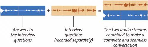 Topics, Guests, and Show Length I'm guessing that you've already established an overall concept for your show, but even though you think "Foot Care for Firewalkers" is a fascinating theme for a podcast, you still need a topic for the first show. I strongly suggest that you choose a topic for the show and stick to it, keeping as much of the content centered on the theme as possible. If you title your podcast "Navel-Gazing for Experts: To the Hole and Back," be sure to stay focused on the topic throughout. People who "tune in" to the podcast have done so because they have read the title and synopsis of the podcast. It is likely that listeners will be disappointed if the podcast strays too far from the announced concepts. It is advisable to make a reference list of related topics so that in the heat of the podcast, you can keep the show on track with just a glance or two at the topic list. Double-Ender Interviews Occasionally, the opportunity to interview someone by phone or even in person will arise before the podcast is set to be recorded. Often, it can be difficult to set up an interview during the podcast recording time, so the interview/conversation is recorded ahead of time. In the realm of radio and television, an interview that is conducted in two parts, with the interviewer's questions being added later, is called a double-ender (Figure 3.4), and this technique can be used successfully by podcasters and professional television reporters alike. Figure 3.4. In a double-ender interview, both sides of the interview are recorded separately and pieced together later.  A double-ender may occur when you want an interview with someone in another city, but you prefer for the interview to sound live rather than tinny, as though it were coming off a phone line (which is your other alternative). In this case, you need to get a friend or someone near the interviewee's location to meet with that person and record the interview there with relatively high-quality equipment. Then, when the file arrives, you record your own voice asking the questions and ultimately put the two together to make it seem like a live interview in which you are directly asking the interviewee the questions! In the world of podcasting, the practice of recording double-ender interviews is usually done to improve the quality of the interview. After the interview is recorded, you can re-record your voice asking the questions, and you can even choose not to run some of the guest's answers during the podcast. In short, using double-ender interviews gives you more control of the quality and content of your podcast. |