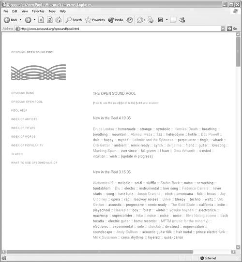 Several of the podcasters I interviewed for this book mentioned Creative Commons as a source for the music they use in their podcasts. If you want to include music in your podcasts, I suggest that you visit the Creative Commons Web site and learn more about what is available. As an artist, you can choose one of several licenses, including: Attribution. You let others copy, display, perform, and distribute your copyrighted work (and derivative works based upon it), but only if they give you credit. Noncommercial. You let others copy, display, perform, and distribute your work, but only for noncommercial purposes. No Derivative Works. You let others copy, display, perform, and distribute only verbatim copies of your work. There can be no derivative works based upon your work. Share Alike. You allow others to distribute derivative works only under a license that is identical to the license that governs your own work. The Creative Commons Web site can point you to several excellent sites that contain Creative Commons licensed sound files and music. One such site is Opsound (www.opsound.com) , shown in Figure 3.36. This site is an excellent source of music that you can use in your podcasts provided that you follow the rules of each license. If the idea of reading the license for each song gets under your skin, remember that licensing commercial music is very expensive and requires far more paperwork. Figure 3.36. Opsound is a great site for Creative Commons licensed music.   | Most of the music on the Opsound Web site falls under the Share Alike Creative Commons license, which means you are free to download it, share it, and include it in your work as long as you attribute the works to the original authors/musicians. The site also contains some public-domain music. |