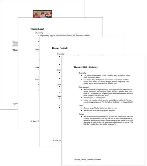 In Activities 1.13 through 1.23, you will create a document describing four of the favorite party themes offered by The Perfect Party. You will add a graphic image to the document, and insert text from another document. Your completed document will look similar to Figure 1.27.
