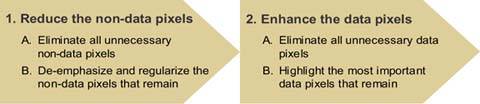 Reducing the non-data pixels to a reasonable minimum is a key objective that places us on the path to effective dashboard design. Much of visual dashboard design revolves around two fundamental goals: