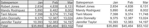 Figure 5-13. Fill colors should be used to delineate rows in a table only when this is necessary to help viewers' eyes track across the rows.