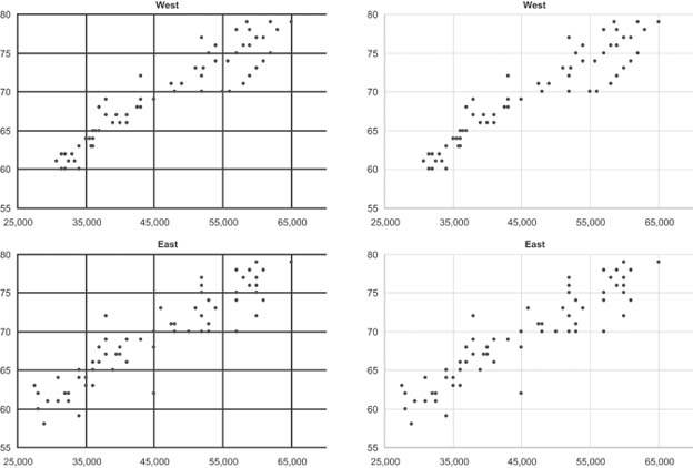 Figure 5-19. Grid lines are useful when they help viewers compare specific subsections of graphs, such as the range of values that fall within 65 to 75 on the vertical scale and 35,000 to 45,000 on the horizontal scale.