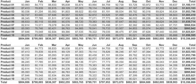 Figure 5-21. Fill colors can be used to delineate rows in a table when necessary to help viewers' eyes scan across the rows, but this should always be done in the muted manner seen below rather than the visually weighty manner seen above.