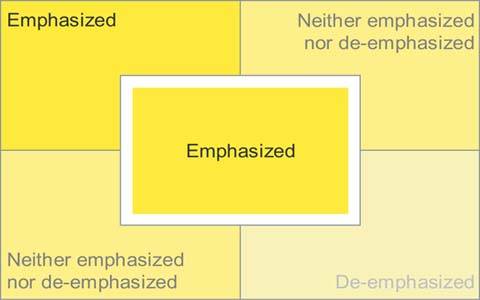 Few aspects of visual design emphasize some data above the rest as effectively as its location. Figure 5-25 identifies the emphasizing effect that different regions of a dashboard provide. The top-left and center sections of the dashboard are the areas of greatest emphasis. The greater emphasis tied to the upper left is primarily due to the conventions of most western languages, which sequence words on a page from left to right and top to bottom. Contrary to the influence of reading conventions, however, the very center of the screen is also a region of strong emphasis, due to a more fundamental inclination of visual perception. I've found, however, that placing information in the center results in emphasis only when it is set apart somewhat from what surrounds it, such as through the use of white space.