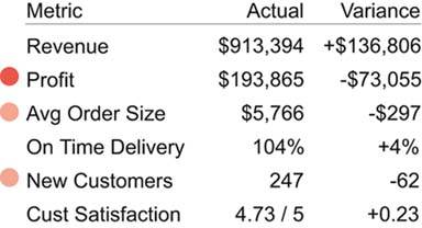 Beware of taking this useful practice of managing by exception too far, however. I received an email recently from an executive of a software company that specializes in dashboards. We were discussing my definition of a dashboard, and in the course of this discussion he stated that a customer once asserted that his ideal dashboard would display a single traffic signal to indicate if everything was all right or if anything needed attention. The idea was that he didn't want to be bothered with unnecessary information if all was well, and when something was wrong, he could drill down from that single alert to additional, more detailed dashboards or reports to determine exactly what was wrong before taking action. For an instant I found myself enamored with this idea, attracted to its Spartan simplicity but only for a moment. The next moment my mind became haunted by visions of executives trying to run their businesses in ignorant bliss, completely out of touch unless thresholds built into the software determined that they ought to be informed. Anyone who has a job to do needs to keep up with a basic picture of what's going on, even when all is well. Too often leaderswhether in business, academia, religion, or politicsforge ahead with their agendas, relying entirely on others to tell them what they think they should know, only to discover after the dust of some destructive event settles that they knew far too little to lead effectively.