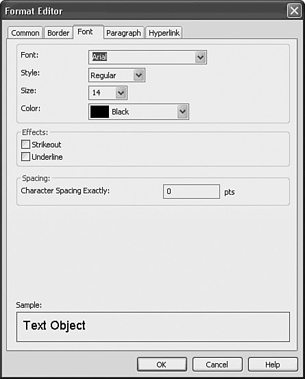 Figure 6.8. The Format Editor dialog provides quick and easy access to a variety of report object properties.  | 3. | Now select the Border tab from within the Format Editor and then select Single from each of the four border Line Style drop-down lists (left, right, top, and bottom). Under Color, click the Background check box and select Yellow from the drop-down list as the background color. Based on all of your selected properties in the Format Editor, you should now see a representative example of the text object in the Sample area at the bottom of the dialog box. Click OK to save these settings and return to the Design tab on your report.