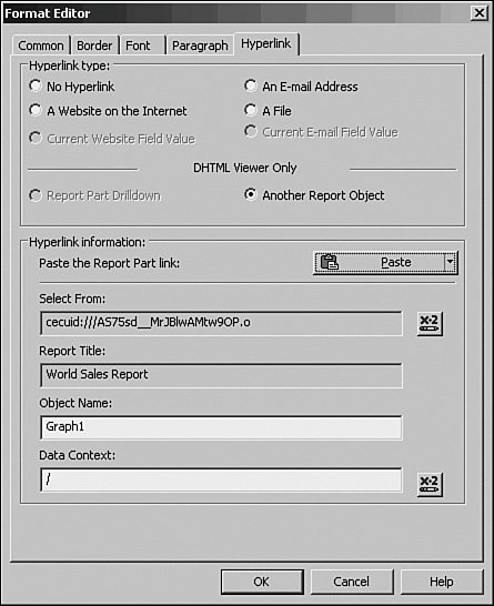 Figure 9.10. Creating a hyperlink to another report.  | 6. | Click OK. From the View menu, choose HTML Preview. When the preview has opened, mouse over the Customer Contact Listing text box and notice that the mouse cursor changes, indicating a hyperlink. Clicking the hyperlink will open the World Sales Report.