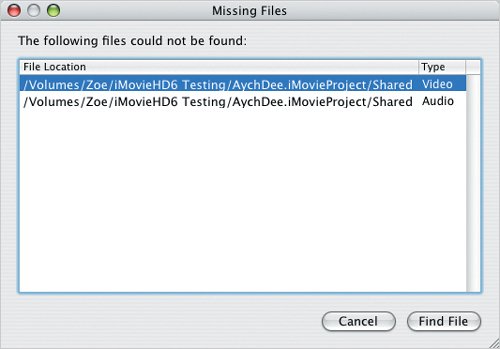 | If iDVD is currently running because you shared a movie from iMovie, you don't need to open, create, or save your projectit's all done for you. If you just launched iDVD independently, you can create a new project or open an existing project from the File menu; doing so closes the current project (only one project can be open at a time). The iDVD project file The iDVD project file by default appears in your Documents folder (within your Home folder), and ends in the extension ".dvdproj". Like iMovie, iDVD stores all of its related files in the project file itself, which is a package. Tips | Many of the newest Mac models sport SuperDrives that burn dual-layer DVD media, which can store up to 8.5 GB of data and hold around three hours of video footage. Make sure you have plenty of free hard disk space availableat least 10 to 20 GB. Storing the project file in the Documents folder may be fine for casual use, but an iDVD project may not fit on your startup disk. While traveling, I move the project file to another partition of my PowerBook's hard disk, or offload everything to a speedy external FireWire drive. If you do move your iDVD project, make sure it can still locate your original iMovie project and its media files. If iDVD gets confused, it warns you with a dialog (Figure 19.1). Select a file from the list and click Find File if the file is actually available somewhere else, or click Cancel to proceed. You can still work on the project if you cancel, but you'll get a broken link warning if you play any of the footage. Figure 19.1. If iDVD cannot locate the media files used in your project, it displays this dialog.