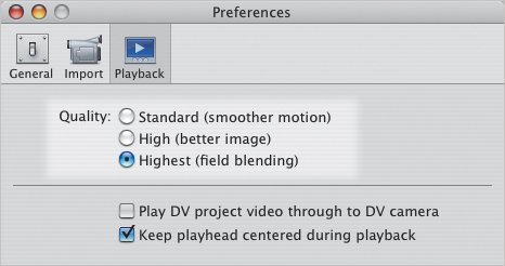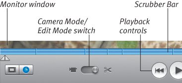 The Monitor The Monitor is where you view and edit clips. A few controls, such as the Scrubber Bar, affect how you edit your clips (Figures 6.6 and 6.7). The playback controls are context-sensitive, and can play clips (Figure 6.8) or control a camcorder (Figure 6.9, next page). Figure 6.6. The left side of iMovie's Monitor controls.  Figure 6.7. The right side of iMovie's Monitor controls.  Figure 6.8. Use these playback controls when you're in iMovie's Edit Mode. To rewind or fast-forward through a clip or movie, use the Scrubber Bar.  Figure 6.9. With Camera Mode enabled, the buttons control the camera's playback functions.  Monitor controls Monitor window. View clips and incoming video from a camcorder. Camera Mode/Edit Mode switch. Toggle between these modes to either import or edit video footage. If multiple cameras are connected, click the Camera Mode icon and choose one from the popup menu that appears. Volume slider. Set the playback volume by dragging the knob or clicking a spot on the slider; this doesn't affect clip volume. Playhead. Drag the Playhead to any point within your movie or clip; the numbers beside it indicate the time location within the movie. Scrubber Bar. When viewing an entire movie, the Scrubber Bar includes lines marking clips and transitions. This is also where you can select portions of clips and cut, copy, or crop them (see Chapter 8). Playback controls (Edit Mode) Home. Click here to move to the start of the movie (or to the beginning of an individual clip if selected in the Clips pane). Play. Click this button to play the video in real time. Click it again to stop playback (or hit the spacebar). Play Full Screen. This button plays the video using the entire screen. Click the mouse or press any key to stop playback and return to the normal window. Playback controls (Camera Mode) Import. With a camera attached, click this button to begin saving the video to your hard disk. Click it again to stop capturing. Rewind/Review. Click this button to rewind the camcorder's tape. If the tape is playing, click and hold to review (play backwards) the footage quickly. Release the button to resume normal playback. Stop. This button stops the camcorder's tape and ceases playback. Play. Click this button to play the video in real time. Pause. Click this button to pause, but still view, the camera's playback. Click it again to resume. Fast Forward. Click to advance the tape without playing it. As with the Rewind/Review control, if the tape is playing, click and hold to view the footage accelerated, then release the button to resume normal playback. Tips | If playback in Edit Mode seems stuttery, try changing the playback method. Choose Preferences from the iMovie HD menu (or press Command-comma), and click the Playback icon. Choose a quality setting by clicking its radio button (Figure 6.10), then close the Preferences window. Figure 6.10. Experiment with the Quality settings in iMovie's preferences if your playback is choppy while editing.  In Edit Mode, the spacebar activates and deactivates the Play button. In Camera Mode, the spacebar activates the Import button. Use the left and right arrow keys to move the video in one-frame increments when you're in Edit Mode. Hold Shift and use the arrow keys to move 10 frames at a time.