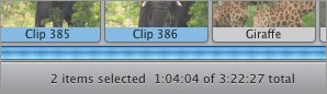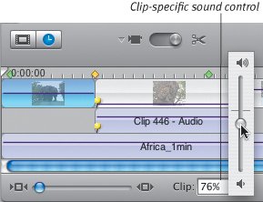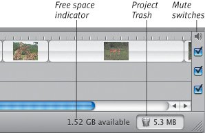 Multiple clips selected  Figure 6.15. The Timeline Viewer offers a better sense of how much time a clip occupies.  The Timeline also includes audio tracks and controls for changing aspects of a clip, which I discuss in the next few chapters. Clip Viewer components Clip Viewer button. Click the filmstrip icon to display the Clip Viewer, or press Command-E to toggle between viewers. Transitions. When you add a transition to your movie, an icon indicates which clip(s) it's attached to (see Chapter 11). Timeline Viewer components Timeline Viewer button. Click the clock icon to bring this viewer to the front, or press Command-E. Video track. The top horizontal bar represents the video track, where clips are displayed according to their lengths. Transitions also appear here, with an icon similar to those found in the Clip Viewer. Audio tracks. iMovie gives you two separate audio tracks to work with, just below the video track. Audio can be extracted from video clips or imported and edited on these tracks. Zoom slider. This control determines how much of the Timeline is shown in the viewer: with the slider at the left, the entire movie appears in the Timeline; with the slider button at full right, you may see only a few seconds, depending on your movie's length. Zooming in is helpful when you're editing small clips or transitions. Clip-specific sound controls. The volume control slider only applies to a selected clip (Figure 6.16). See Chapter 10 for more on editing audio. Figure 6.16. The sound control at the bottom only applies to selected clips.  Mute switches. Uncheck a box to turn off the volume in its associated video or audio track (Figure 6.17, next page). This doesn't affect any volume adjustments you've made to particular clips. Figure 6.17. Mute switches turn audio on and off for an entire track. The Project Trash and free space indicator appear in the Clip Viewer as well.  Project Trash and free space indicator Project Trash. When you delete clips, they're sent to the Project Trash; the amount of data in the trash is indicated to the right of the icon (Figure 6.17). Clicking the Trash gives you the option to empty it or pull items out (see Chapter 7). Free space indicator. The numbers indicate the amount of available space on the hard disk where your project is stored. When the text turns yellow, you're getting low; red text means you're critically low on space. Tip | iMovie HD no longer features the Clip Speed slider, which used to be below the Timeline Viewer and enabled you to speed up or slow down clips. Instead, that functionality has been moved to the Fast/Slow/Reverse effect in the Effects pane (see Chapter 13).