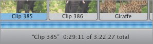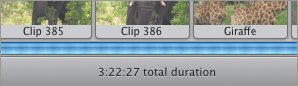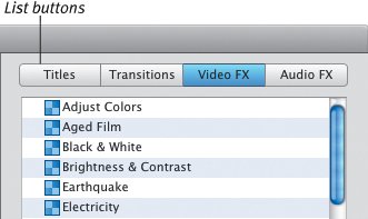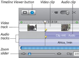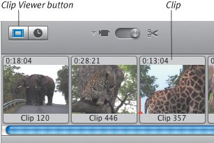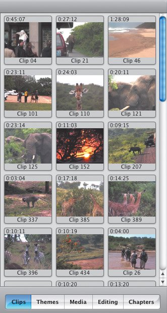 The Clips pane Think of the Clips pane as a big rack filled with lots of videocassettes, photos, and audio reels (but much better organized); this is where you store your raw footage in preparation for editing (Figure 6.11). It's also where you find controls for working with themes, photos, audio, titles, transitions, effects, and chapter markers for iDVD or GarageBand. Figure 6.11. The Clips pane, in addition to storing clips, serves as the area for controlling other features such as transitions, effects, and titles.  Clips pane components Clips pane. The purpose of the Clips pane is to store your clips, which are arranged in a grid. Use the scroll bar at right to view more clips. Pane buttons. The Clips pane doubles as the control center for working with themes, photos, audio, titles, transitions, and effects. Click one of the buttons at the bottom to activate a pane. (Each is discussed at length throughout the book.) List buttons. In iMovie HD 6, the Media and Editing panes include separate lists for functions such as photos, titles, and effects. After you click a pane button, click a list button at the top of the pane to narrow your choices (Figure 6.12). Figure 6.12. Click a button at the top of a pane to access lists of media or editing features.  Tip The Timeline The Clips pane may hold all of your raw video clips, but you don't have a movie until you start moving them to the Timeline, which encompasses the Clip Viewer and Timeline Viewer. The viewers are two different ways of looking at the structure of your movie. The Clip Viewer displays clips in the order that they play, with large thumbnail previews to help identify them (Figure 6.13). The Timeline Viewer arranges the clips in order and also depicts their lengths (Figure 6.15, opposite page). Figure 6.13. Using the Clip Viewer is often easier than the Timeline Viewer when adding clips.  Speaking of length, you can always view the duration of your movie at the bottom of the iMovie window (Figure 6.14). With nothing selected, you see the total duration; with one or more clips selected, iMovie displays the amount of time they represent. Figure 6.14. Look to the bottom of the main window to view lengths of specific clips and of the total movie.