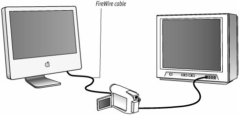 Monitoring Your Movies iMovie's Monitor window is invaluable, and the Play Full Screen feature is helpful when you need to get a better feel for how the movie will display. However, consider hooking up an external television or AV monitor so you can see how your movie will really look to your audience (Figure 6.19). (If your movies are destined only for display on the Web or via email, you may not want to go to this trouble.) Figure 6.19. Adding an external television or AV monitor to your iMovie setup lets you see how the video appears on a real video screen.  You'll need your computer, a television or AV monitor with RCA-style input jacks, and your digital camcorder. You'll also need the FireWire cable to hook up your camcorder to your Mac, and the AV cable that came with your camcorder, which allows you to view movies on a TV (it normally has three connectors on one endyellow, red, and whiteand a single connector that plugs into the camera, though some models work with S-video cabling, too). To hook up an external monitor: 1. | Connect the camera to your computer via the FireWire cable.