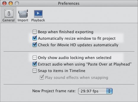 Changing View Preferences You can tweak some of the ways clips are displayed by setting options in iMovie's preferences (Figure 6.18). Automatically resize window to fit project. This option depends on the project's video format. Only show audio locking when selected. You can lock audio clips individually, which are then shown with a pin icon (see Chapter 10). This option shows the icon only when the clip is selected. Figure 6.18. A few of iMovie's preferences affect how clips appear in the Clip Viewer and Timeline Viewer.  |