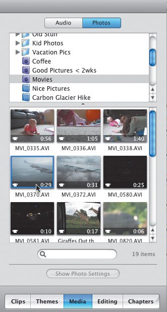 | Tips | You can import movies from iTunes, too, via the Audio list in the Media pane. See Chapter 9 for more information on importing pictures from iPhoto, and Chapter 10 for more on adding music. If you're importing an MPEG video and it has no sound, convert it using the free MPEG Streamclip (www.squared5.com).