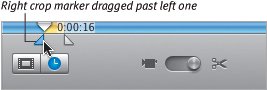 | Tips | You can click and drag at any point on the Scrubber Bar to make a selection; you don't need to drag the crop markers from the left side of the bar. Click on another clip or at the top of the Timeline Viewer to deselect the frames. You can also choose Select None from the Edit menu (Command-Shift-A). If you move the right crop mark past the left crop mark, it becomes the left mark (Figure 8.28). However, if you use the Shift-click method, the selection is extended in the direction based on which crop mark is closest. Figure 8.28. Dragging one crop marker past the other swaps their positions (right becomes left, or left becomes right). This allows you to make a different selection in only one mouse move instead of several.  With a selection made on the Scrubber Bar, choose Select All from the Edit menu (or press Command-A) to highlight all the frames in the clip; conversely, choose Select None from the Edit menu (or press Command-Shift-A) to cancel your selection. This only works when you have a single clip selected; otherwise it selects or deselects all clips in your movie.