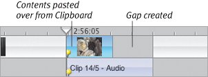 When you use the paste-over technique, you're actually overwriting the existing footage (versus overlaying something such as a title; see Chapter 12). This means that if you delete the pasted-over clip, the existing footage is hidden. You can recover the "lost" footage by Direct Trimming, using Undo, or by completely restoring the clip media (explained at the end of this chapter). If you're looking for a Robert Altmanesque audio effect where the audio from both clips plays simultaneously, use the Paste Over at Playhead command. Click the pasted clip (which retains its embedded audio track if the Extract audio in paste over option is enabled), then edit its volume (see Chapter 10).