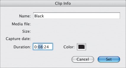Figure 8.41. The Clip Info dialog for blank clips includes an option to change the clip's duration.  | 3. | Change the time in the Duration field.