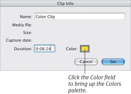 | Tips | Be careful when selecting colors. Intense reds, for example, bleed on most television screens. This is a good reason to have an external video monitor connected to your editing system (see "Monitoring Your Movies" in Chapter 6). Blank clips don't need to be just placeholders. If you need some black footage longer than what's available using a transition such as Fade In or Fade Out, for example, insert a black clip. You can even paste the clip over footage to keep the audio playing while the screen is dark (see "Pasting Clips over Clips," earlier in this chapter).