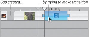 | Tips | Since transitions become their own clips, you can edit their volume levels, including fading sound in and out. The Fade In and Fade Out transitions apply audio fades automatically, which you can edit (see Chapter 10). If you've selected multiple types of transitions in the Timeline and then change the settings in the Transitions pane, they will all become the one type that's highlighted in the Transitions pane's list. You can't move transitions the way you can rearrange other clips. In fact, if you try to grab one and move it in the Timeline Viewer, the clips connected to it can get shifted to the right, creating a gap (Figure 11.11). It's better to delete the transition and place another in the new location. Figure 11.11. Attempting to move a transition can cause the clips attached to it to shift within the Timeline Viewer.