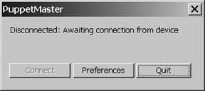 Installation of the software is simple. Accept all of the defaults. Once PuppetMaster has been installed, run it from the Start Menu. A circular icon will appear in the taskbar, indicating the program has loaded, and you should see the status window shown in Figure 1-27.