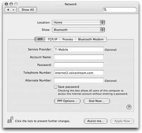The last thing you'll need to do is make sure your Network settings are configured to use the new connection. Open System Preferences and click on Network. In the Network Port Configurations section, make sure your new phone connection is checked. Finally, click on the PPP tab and make sure the information you entered during Bluetooth setup is listed, as shown in Figure 1-10.