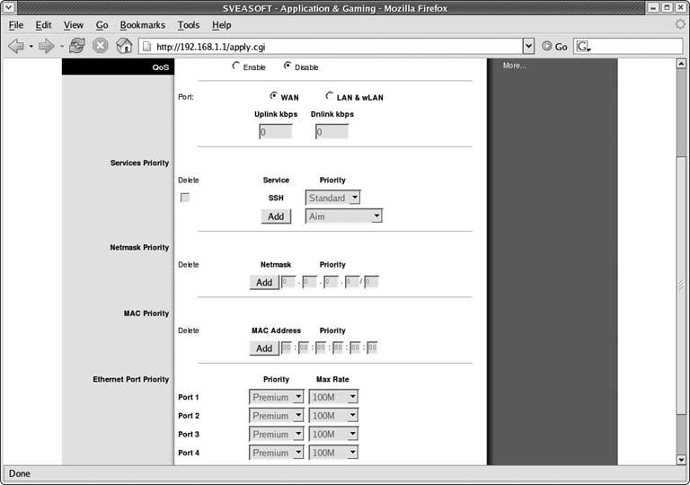 As shown in Figure 5-2, you can set the maximum uplink and downlink speeds for your WAN or LAN/Wireless connections. Once enabled, you can set QoS service priorities for protocols such as SSH, VoIP, and many others. This means that you can set the service priority for VoIP to High to ensure no other traffic takes priority. You can also set priorities for specific netmasks, MAC addresses, or the four Ethernet ports on the WRT54G.