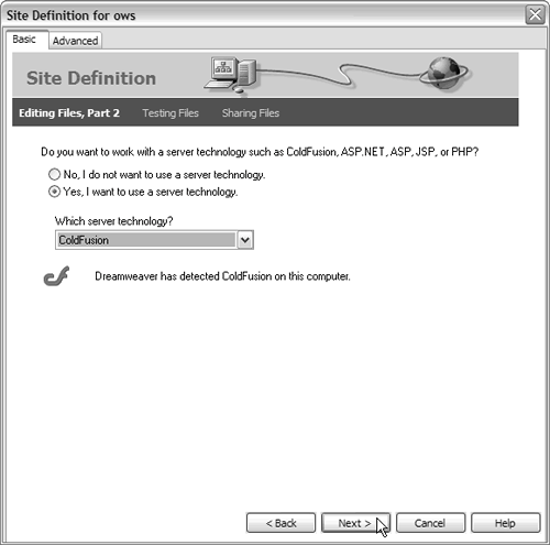 | 5. | You can use Dreamweaver to create static sites (ones that don't use server-side processing), as well as dynamic sites powered by several different server-side technologies. You're creating a ColdFusion site, so check the "Yes, I want to use server technology" option, and make sure you've selected ColdFusion as the server technology to use. If ColdFusion is installed locally (it should be), Dreamweaver will detect and state its presence, as seen in Figure 2.6. When you have made your selections, click the Next button.