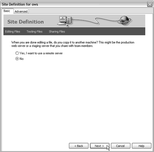 | 8. | Sites defined in Dreamweaver can point to up to three servers: a local server (for development), a testing server, and a production server. You won't be using any remote servers for the ows application, so select No as shown in Figure 2.10, then click the Next button.