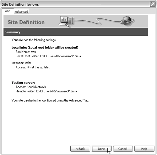 Figure 2.11. Before creating the new site, Dreamweaver displays a summary of all the chosen settings and options.