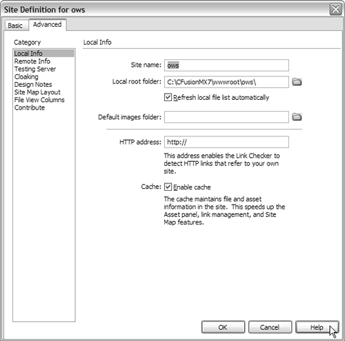 | NOTE In the future you can open the site by selecting it from the drop-down list at the top of the Files panel. About the Advanced Site Definition Dialog You learned about the Basic category when creating the ows site definition. At some point, you may wish to set up additional options in the Advanced section of the Site Definition dialog (Figure 2.13). Figure 2.13. Use the Advanced category to set up additional site definition options.  To edit an existing site, double-click the site name (ows, in this case) in the list menu located in the Files panel. If the Basic category is shown, click the Advanced tab. The following describes what you'll find in the categories listed on the left in the Advanced section of the Site Definitions dialog: Local Info. The information contained in this category pertains to the location of the site on your local machine and allows you to enable and disable the site's cache, which helps manage links and other site operations. Remote Info. This section holds the data needed to connect to the remote server via FTP, Local/Network, RDS, SourceSafe, or WebDAV. Testing Server. This section stores the facts relating to the server used for testing your application. Cloaking. This section specifies file types that should not be included in site operations such as uploading using Dreamweaver's cloaking feature (see "The Files panel" section later in this chapter). Items such as original source files for graphics and Flash usually don't need to be uploaded to the server, and therefore the .png and .fla file extensions are already listed for you to include as cloaked file types. To add other file types to the list, just type a space, followed by the file extension, at the end of the list. TIP Two common file types that you may wish to cloak are Dreamweaver templates (.dwt) and library items (.lbi). If these are listed, Dreamweaver knows not to include the files in operations such as uploading. Though cloaked files are usually excluded from the Assets panel, Dreamweaver is smart and knows to include templates and library items in those operations.