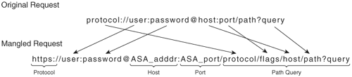With URL mangling, the original protocol, host address, port number, and path get manipulated to establish connectivity to the Cisco ASA. The original protocol field is replaced with https, while the original address and port are replaced with the IP address and port of the security appliance. The mangled path in the URL is augmented with the protocol, port, and host elements of the original URL. Figure 16-20 shows the original and the modified URLs.