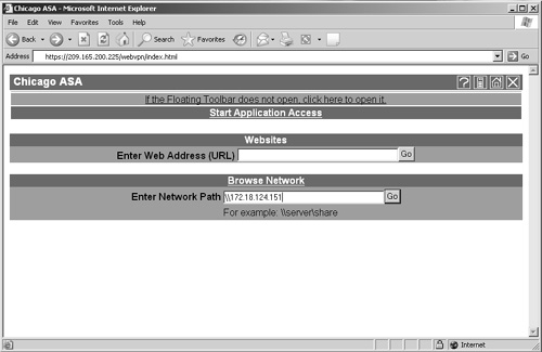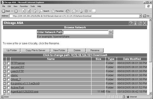 Cisco ASA does not enable CIFS functionality until the functions parameter is set up to allow file browsing, file access, and file entry. The configuration in Example 16-86 sets up Cisco ASA with a user group-policy named SecureMeWebGrp, which allows users to browse, access, and enter file information using the functions attribute.