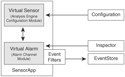 The Virtual Sensor is the Analysis Engine Configuration Module, which handles the AIP-SSM configuration. This module interprets the configuration and maps it into internal configuration objects. Figure 14-2 illustrates both of these modules.