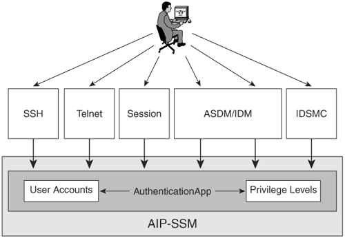 AuthenticationApp controls authentication when the user connects via Telnet, SSH, a session through ASA, ASDM, IDM, or IDSMC. This is illustrated in Figure 14-3.