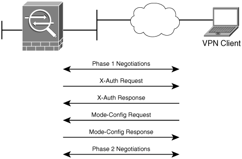 The Cisco VPN client uses aggressive mode if preshared keys are used, and uses main mode when public key infrastructure (PKI) is used during Phase 1 of the tunnel negotiations. After bringing up the ISAKMP SA for secure communication, Cisco ASA prompts the user to specify the user credentials. In this phase, also known as X-Auth or extended authentication, the security appliance validates the user against the configured authentication database. If the user authentication is successful, Cisco ASA sends a successful authentication message back to the client. After X-Auth, the Cisco VPN client requests configuration parameters such as the assigned IP address and the DNS and WINS server IP addresses, to name a few. During this phase, known as mode-config, the security appliance sends the configured parameters back to the client. The final step for a successful VPN tunnel is the negotiation of Phase 2 parameters, as illustrated in Figure 16-1. After completing the tunnel negotiations, the client can send or receive traffic over the connection.