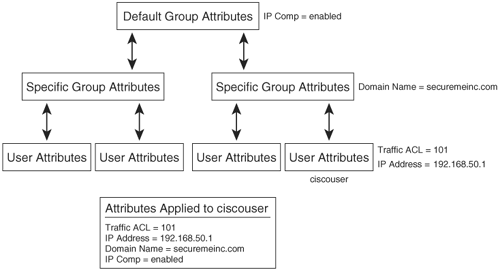 Cisco ASA implements the inheritance model, where a user inherits the mode-config attributes from the user policy, which inherits its attributes from the user group-policy, which in turn inherits its attributes from the default group-policy, as illustrated in Figure 16-3. A user, ciscouser, will receive traffic ACL and an assigned IP address from the user policy, the domain name from the user group-policy, and IP Compression along with the number of simultaneous logins from the default group-policy.
