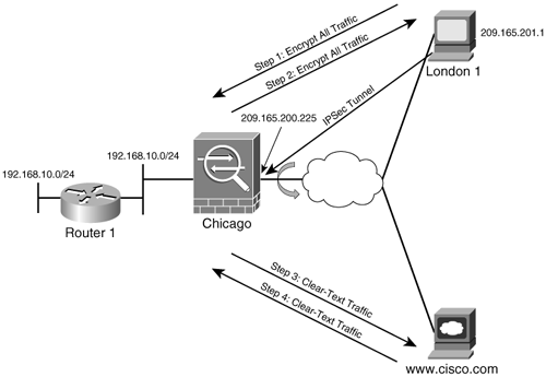 Once the tunnel is up, the default behavior of the Cisco VPN client is to encrypt traffic destined to all the IP addresses. This means that if a VPN user wants to browse www.cisco.com over the Internet as illustrated in Figure 16-4, the packets will get encrypted and sent to the Cisco ASA. After decrypting them, Cisco ASA will look at its routing table and forward the packet to the appropriate next-hop IP address in clear-text. These steps are reversed when traffic returns from the web server and is destined to the VPN client.