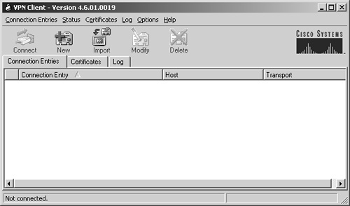 In the Windows-based operating systems, the Cisco VPN client can be launched by running the VPN client executable found under Start > Program files > Cisco Systems VPN Client once it is installed. The operating system runs the executable and displays the VPN Client utility, as depicted in Figure 16-5.