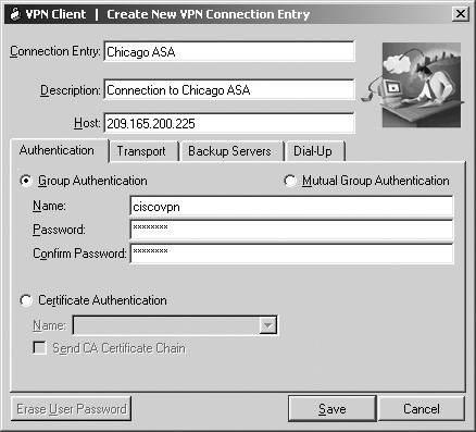 You can configure these parameters on the Cisco VPN client by clicking the New icon. The Cisco VPN client shows a different window in which you can enter the necessary information. In Figure 16-6, the user has specified the Connection Entry as Chicago ASA. You can name this entry any name you like. It only has local significance and is not forwarded to the security appliance. You can optionally enter the description for this connection entry. In this example, the connection description is Connection to Chicago ASA. The VPN client requires you to input the IP or the hostname of the security appliance. Because the public IP address of the security appliance in Chicago is 209.165.200.225, the VPN client is set up to use this address. The group name that the VPN client is configured to use is ciscovpn, and the group password is cisco123, displayed as asterisks. The group password on the client is the preshared key configured on the security appliance.