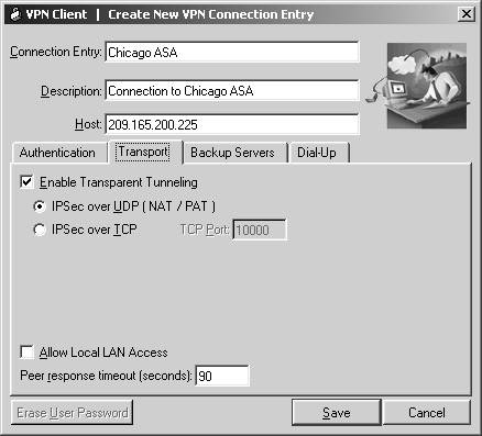 You can specify what type of data encapsulation the Cisco VPN client should be using. This is set up under the Transport tab, as shown in Figure 16-7. If IPSec over UDP or NAT-T is the encapsulation mode, then check the Enable Transparent Tunneling box with IPSec over UDP (NAT/PAT) as the selected option. If IPSec over TCP is the required encapsulation, then select IPSec over TCP and specify the appropriate port number. In this example, IPSec over UDP is the selected transport protocol.