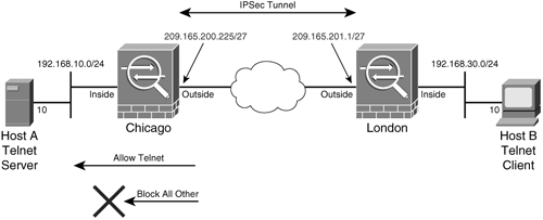 Like a traditional firewall, the Cisco ASA protects the trusted network from outside traffic, unless the ACLs explicitly permit traffic to pass through it. The same concept is applied when the packets are decrypted by the IPSec engine. If there are no permits in the outside interface access list, the security Cisco ASA drops the decrypted packets as its default behavior. In Figure 15-2, Host B is only allowed to send traffic to Host A, located across the VPN tunnel, on TCP port 23. The Chicago ASA has an inbound access list called outside_acl applied to its outside interface, illustrated in Example 15-10.