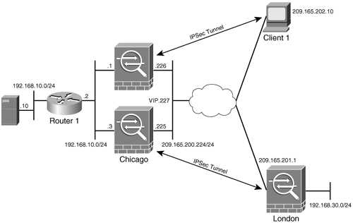 SecureMe's headquarters office in Chicago wants to deploy Cisco ASA to be used for remote-access VPN tunnels that will support about 2000 users. However, SecureMe wants to make sure that users do not overburden the system and therefore wants to use two security appliances in load-balancing mode. Figure 16-14 shows SecureMe's network topology in Chicago.