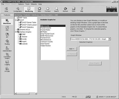 The Monitoring screen displays statistics about the hardware and software features of the security Cisco ASA. ASDM provides real-time graphs to monitor the health and status of Cisco ASA. Figure 18-12 shows the initial Monitoring screen.