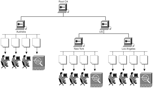 In the example in Figure 17-2, the root CA server has two subordinate CAs, US and Australia. The US CA server also has two subordinates, New York and Los Angeles. Each CA server grants or denies certificate enrollment requests from its corresponding users and network devices (Cisco ASAs in this example).