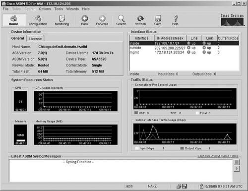 If the user authentication is successful, ASDM checks the current version of the stub application and downloads a new copy if necessary. It loads the current configuration from the security Cisco ASA and displays it in the GUI, as shown in Figure 18-3.