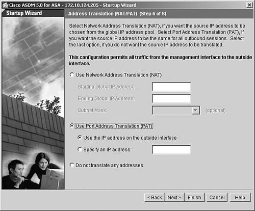 In Figure 18-9, ASDM is being set up to dynamically translate the inside hosts to the outside interface's IP address using PAT.