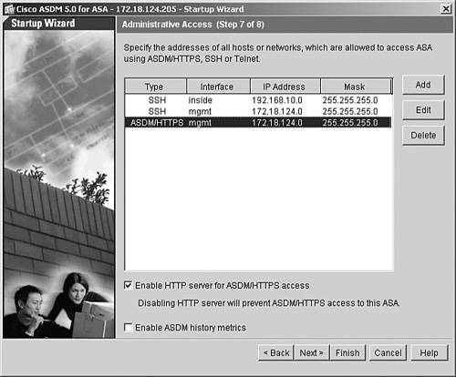 The last configuration step in the Startup Wizard allows you to set up administrative access to Cisco ASA. As discussed in Chapter 4, the security Cisco ASA supports Telnet and SSH as the CLI-based remote management protocols, and supports ASDM as a GUI-based application. You can specify the allowed IP addresses on each of the interfaces for each of the management protocols. In Figure 18-10, the 192.168.10.0/24 network is allowed to establish SSH connections to Cisco ASA from the inside interface, while the 172.18.124.0/24 subnet is allowed to establish SSH and HTTPS connections from the mgmt interface.